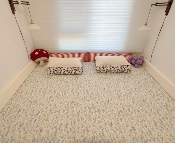木质的地板正好搭配着木质的床,整体看着就像是一体一样,只需要简单进行家具搭配,即可打造出不一样的场景。